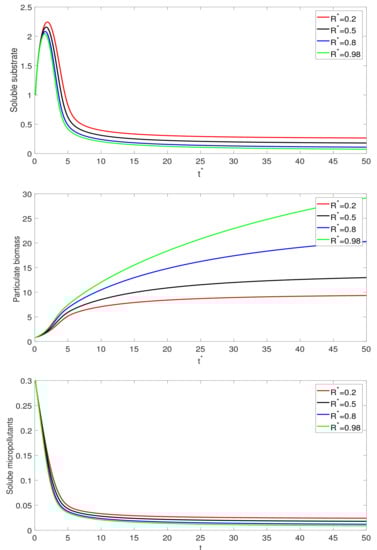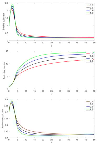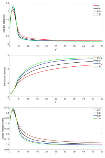 In this part, we illustrate the numerical results graphically for various scenario. The parameter values used for the graphical analysis are as follows: , , , , , and . For the other parameters, we suggest two types of compound used for micropollutant biotransformation parameters. One is highly biodegradable and the other is slowly biodegradable compounds. The values of , , and are given in Table 1.