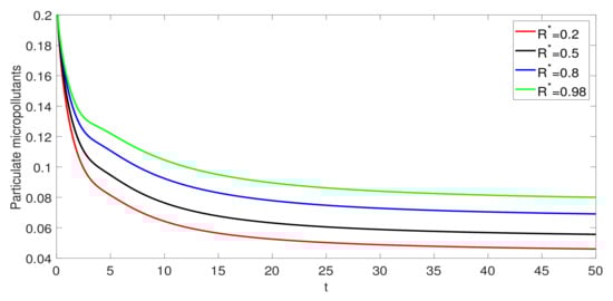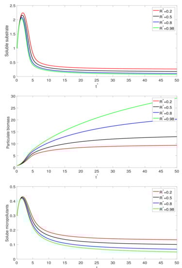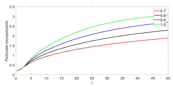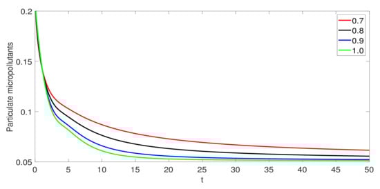 The graphical illustration is discussed for the two different compounds; one is IBP and other is SMX. In Figure 1, the effect of the recycle ratio is presented for IBP and . After an abrupt increase, it is noticed that the soluble substrate is decreasing when the recycle ratio is increasing. However, particulate biomass is increasing when the recycle ratio increases. The particulate biomass attains its maximum value at the higher value of . It is also observed that, as the recycle ratio increases, then soluble micropollutants decrease and particulate micropollutants increase. Thus, the recycle ratio has an important role in the activated sludge processes. In Figure 1, the effect of the recycle ratio is presented for SMX and . After an abrupt increase, it is noticed that the soluble substrate is decreased when the recycle ratio is increasing. However, particulate biomass is increasing when the recycle ratio increases. The particulate biomass attains its maximum value at the higher value of . It is seen that, as the soluble micropollutant increases rapidly and then become stable with the passage of time, particulate micropollutants decrease. We observe different dynamics of the soluble micropullaunt and particulate micropollutants in Figure 1 and Figure 2 and because we used two different compounds for biodegradation. The IBP is highly biodegradable while SMX has low biodegradability. In Figure 3 and Figure 4, we show the effect of fractional order on the evolution of the model for IBP and SMX, respectively. As increases, the rate of decay or growth becomes slower, and vice versa. Thus, the fractional order has an important role in the rate of decay or growth process of the model.