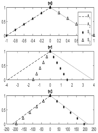 Line graph in Figure 6 ( and stand for increasing parts of triangular fuzzy numbers, and stand for decreasing parts of triangular fuzzy numbers) shows that Aleeza and Sophie will show the same behaviour in the future. It means that there is no change due to interference of Qadeer. Furthermore, the graphs for Aleeza and Sophie are overlapping. Figure 7 is a projection of on plane and shows that the system is unstable.