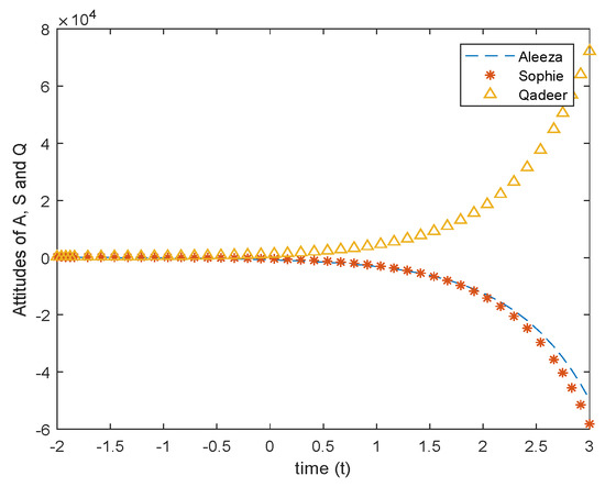 The line graph in Figure 10 shows that Aleeza and Sophie will exhibit almost the same behaviour in the future, but Qadeer will behave differently. Note that Figure 11 indicates that the system is of saddle type. This result can also be obtained by using FICs.