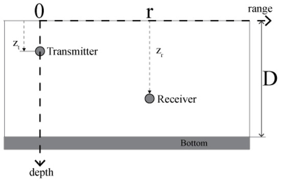 The practical setup, shown in Figure 1 is further considered. In this setup, it is assumed that the transmitter is located in the water at the depth of , whereas the receiver is located at the depth of meters. It is assumed that the wave is transmitted through an isovelocity channel as in [55,56,57,61,62,63,67]. The distance between the transmitter and the receiver is r.