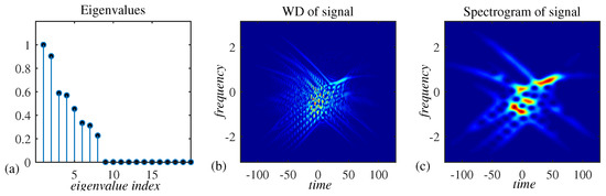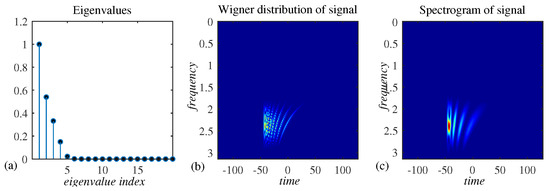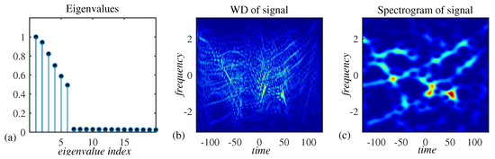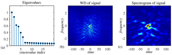 (a) Eigenvalues of autocorrelation matrix , (b) Wigner distrubution and (c) spectrogram of the considered acoustic signal from the dispersive environment. The number of sensors is , whereas the number of modes is .