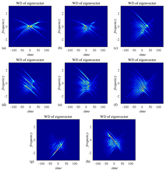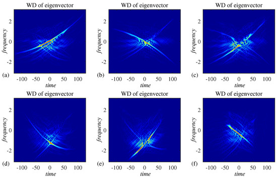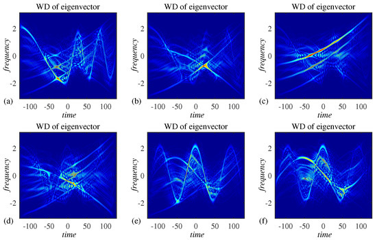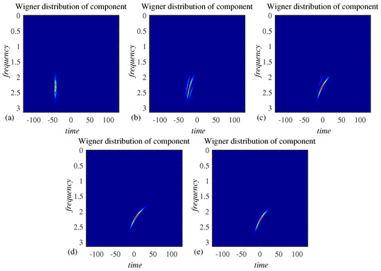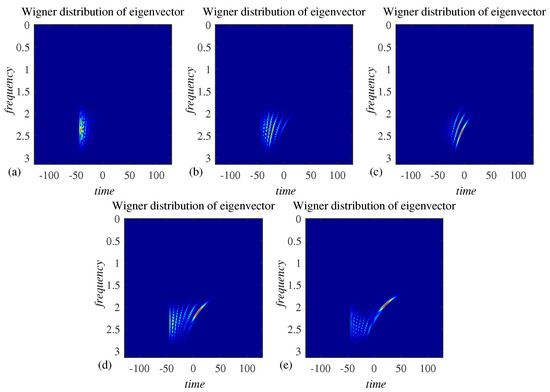 Upon performing the eigenvalue decomposition of autocorrelation matrix , eigenvalues shown in Figure 15a are obtained. The Wigner distribution of the received signal is shown in Figure 15b, with very close and partially overlapped nodes. Wigner distributions of individual eigenvectors are shown in Figure 16a–e. The presented procedure for the decomposition of multicomponent signals successfully extracted the individual acoustic modes, as presented in Figure 17a–e. Such separated acoustic modes can be further analyzed; for example, their IF can be estimated and characterized.