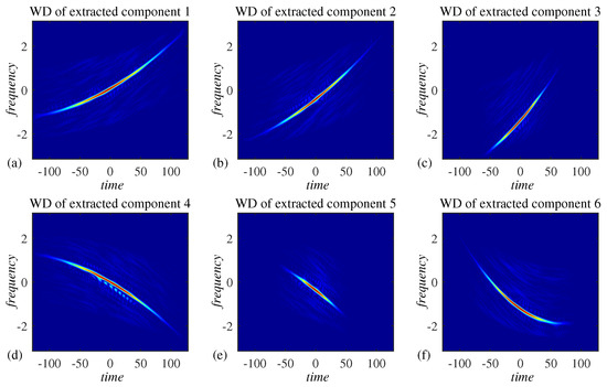 Decomposition of non-stationary multicomponent signals has been a long-term, challenging topic in time-frequency signal analysis [19,20,21,22,23,24,25,26,27,28,29,30,31,32,33,34]. Although decomposition of non-overlapping components can be done using the S-method relations with the WD [26], this approach cannot be applied when the components partially overlap, i.e., share the same domain of support in the time-frequency plane.