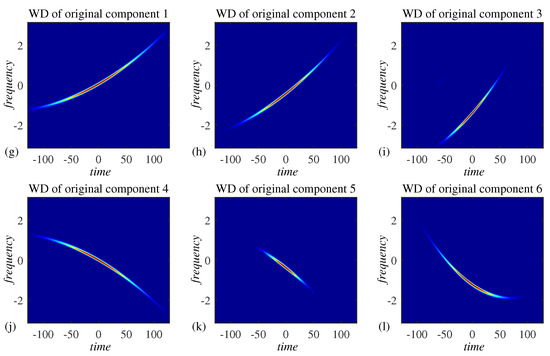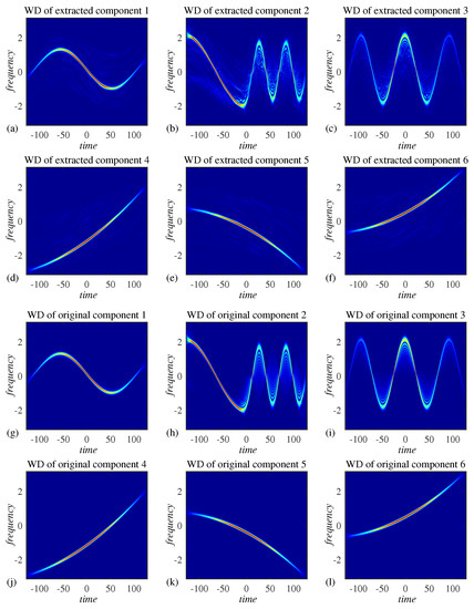 Extracted and original signal components of the non-stationary multicomponent multichannel signal considered in Example 3. Panels (a–f) present the extracted using the proposed approach, whereas panels (g–l) show Wigner distributions calculated for individual components of the original, noise-free signal.