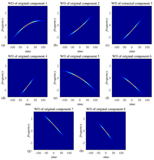 - Non-overlapped components. Note that the case when no components and overlap in the time-frequency plane implies that these components are orthogonal. In that case, the right side of (25) becomes:where . The considered case of non-overlapped (orthogonal) components further implies that