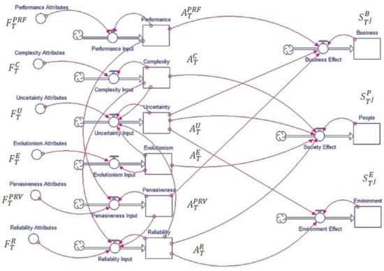 The SD model consists of six impact streams (performance, complexity, uncertainty, evolutionism, pervasiveness, and reliability). Flows are interconnected and interacting. Each flow is affected by the corresponding set of essential attributes . Each flow affects the associated stock. The resource set affects three sustainability effect flows . All of the above flows have a cumulative effect on each of the associated resources, i.e., the more significantly the resource changes, the greater the resource feedback to the input flow is.
