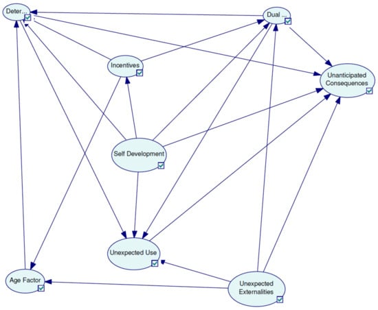 where denotes determined and systematic impacts; denotes unexpected stochastic externalities; denotes the age dynamics factor; denotes technology self-development; denotes unexpected use; denotes unanticipated consequences; denotes dual-use technologies; and denotes incentives.