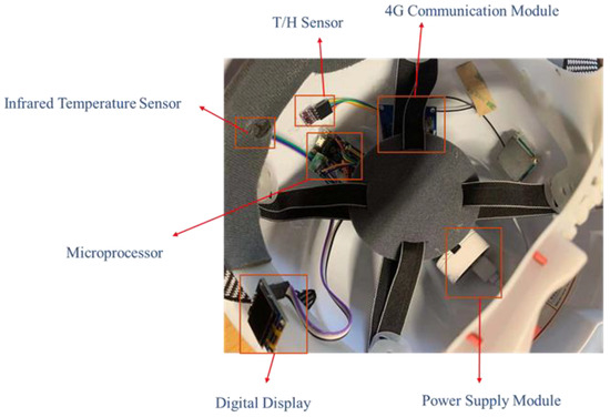 This study utilizes a smart helmet equipped with an infrared temperature sensor to continuously monitor and track the body temperature of personnel to obtain actual temperature data. The smart helmet is self-developed. In order to guarantee continuous data acquisition and communication, and to consider the subsequent temperature data correction needs, the smart helmet measurement system also includes a Temperature/Humidity (T/H) sensor for collecting the temperature and humidity inside the helmet, a 4G communication module for data transmission, a microprocessor for the control system, a digital display for data reading, and a rechargeable power supply module. The system is arranged as shown in Figure 1.