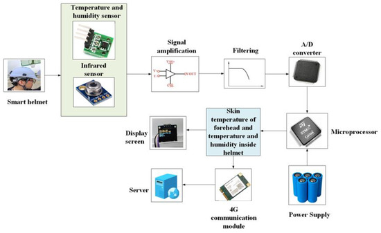 The T/H sensor is placed inside the helmet to collect real-time temperature and humidity data during the wearing process to support the subsequent temperature data correction. The infrared temperature sensor is placed on the contact point between the helmet liner and the human forehead to collect the infrared signal from the human forehead skin. Although in practical applications a temperature measurement accuracy of 0.1 °C is enough, higher measurement accuracy and resolution can bring more information, which helps to improve the application effect of the model. The infrared temperature sensor model used in this study is MLX90614ESF, and the measurement resolution of the sensor is 0.01 °C (measurement accuracy is 0.05 °C). The infrared signal collected by the infrared temperature sensor is transmitted to the microprocessor for processing after a series of amplification and filtering, and the temperature data of the human forehead skin is outputted. The smart helmet measurement process is shown in Figure 2.