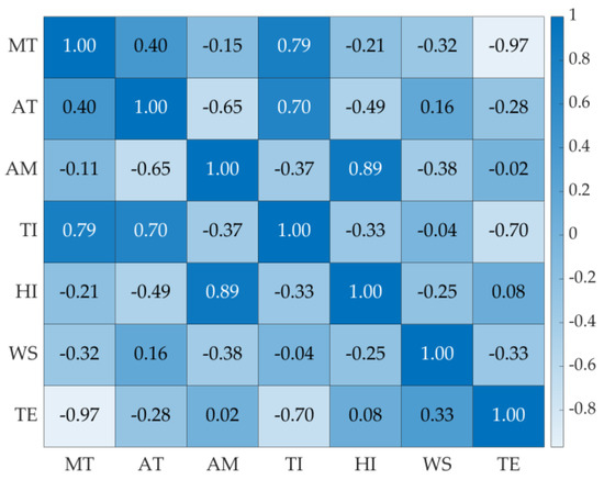 To verify this view, and to explore the correlation between ambient temperature (AT), ambient humidity (AH), temperature inside helmet (TI), humidity inside helmet (HI), and wind speed (WP) and temperature error (TE), the correlation coefficient between them is calculated, and the results are shown in Figure 7.