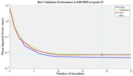 In this study, the initial learning rate is , a = 1.05, b = 0.7, the number of hidden layer neurons is 10. Seventy percent of the 490 groups of sample data are used as training set: 15% as a test set, and the other 15% as a verification set. Mean Square Error (MSE) is used to determine the fitting accuracy of the model. Figure 8 shows the MSE change curve of the model. It can be seen from the figure that the MSE of the data fitting results of the training set, test set, and verification set changes with an increase in the number of model epochs. The training stopped after 25 epochs of the model, and the model accuracy reached the requirements. The MES of the validation set was minimized at the 19th epoch, with a value of 0.007289.