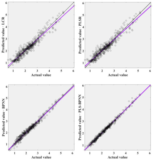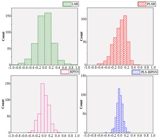 In order to test whether the modeling method of coupling a PLS and BP neural network has an improvement for the accuracy of the model compared with the single modeling method, this study used Least Square Regression (LSR), Partial Least Square Regression (PLSR), and BP neural network (BPNN) for modeling based on the same data, respectively. The fitting scatter plots and residual histograms of four temperature error compensation models are shown in Figure 9 and Figure 10.