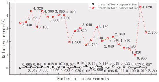 As can be seen from Table 3, the accuracy of the temperature data collected directly by the smart helmet can hardly meet the needs for body temperature detection, and the relative average error reaches 2.80 °C, and the RMSE is 1.052. Then, the temperature error compensation was calculated using the PLS-BPNN model. After using the PLS-BPNN model to compensate the calculation, the relative average error is reduced to 0.055 °C, and the RMSE is also reduced to 0.0671. Figure 11 shows the relative temperature errors before and after compensation.