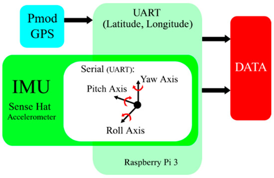 In Figure 1, we show the modular data acquisition system implemented in this work. The system consists of a GPS Pmod sensor that is used to obtain latitude and longitude coordinates of the current position and a shield Sense HAT for Raspberry to measure the current inclination on the three Pich, Roll, and Yaw axes through its accelerometer. All the register data is stored in CSV format files for post processing on a PC.