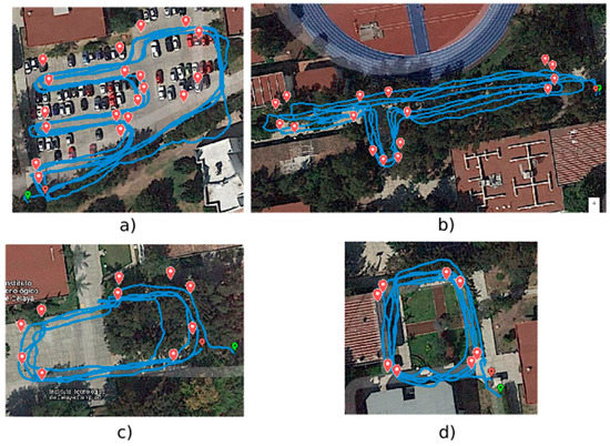 The red markers in Figure 2 correspond to initial and final points from which the lines that circumscribe the reference are constructed and the blue lines represent the path of the data acquisition module along each route. Parameters such as distance traveled, duration, and velocity are presented in Table 1.