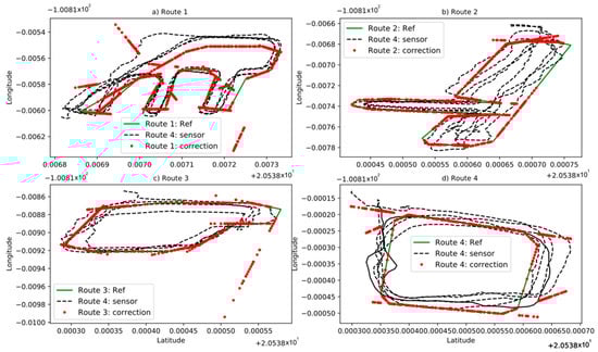 Sensor data and reference, (a) route 1, (b) route 2, (c) route 3, (d) route 4.