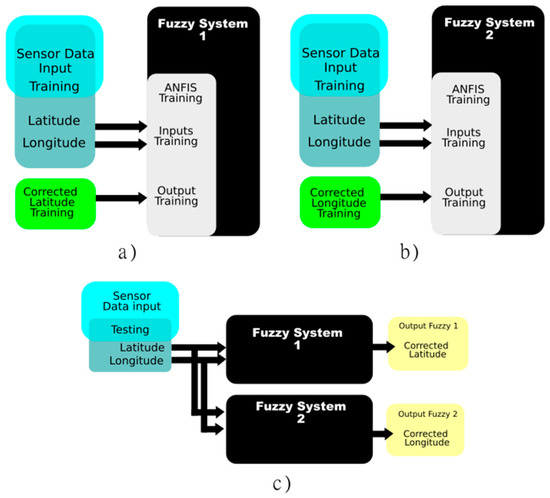 In this work, we use the ANFIS toolbox [22], which allows us to generate a MISO (multiple input, single output) fuzzy inference system based on the Takagi Sugeno method [23]. With this toolbox, the fuzzy system can simultaneously perform a correction from two inputs, latitude and longitude. In this regard, we generated two fuzzy systems one for latitude correction and the other one for longitude correction. Both fuzzy systems receive the same information from the sensor. The data used for training and validation is shown in Table 2. This is the data collected with the sensor for each route. This is illustrated in Figure 6, where 6a and 6b correspond to the training setup of the two fuzzy systems. Figure 6c represents the system on the testing stage.