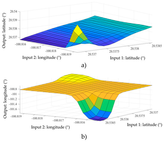 After training, MATLAB’s evalfis tool [25] was used to evaluate them with the test data. From the evaluation of both fuzzy systems, two vectors were obtained with the corrected latitude and longitude outputs.