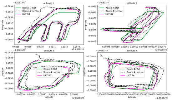 Sensor data vs. UKF response. (a) route 1, (b) route 2, (c) route 3, (d) route 4.