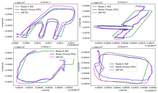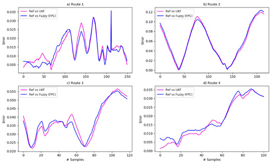 Error: reference vs. fuzzy systems response vs. UKF. (a) route 1, (b) route 2, (c) route 3, (d) route 4.
