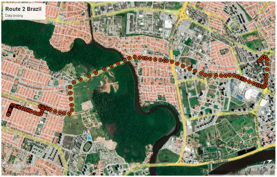 Before using these corrected coordinates (red dots in Figure 5) in the training stage, it is necessary to apply a data cleaning technique such as removing the outliers. The criterion used was the distance between the reference and the corrected latitude and longitude data: when the distance is greater than 3 m then the point is considered an outlier and is removed from the data set to be used for training. It is important to note that the raw data coming directly from the GPS sensor was used in the testing stage.