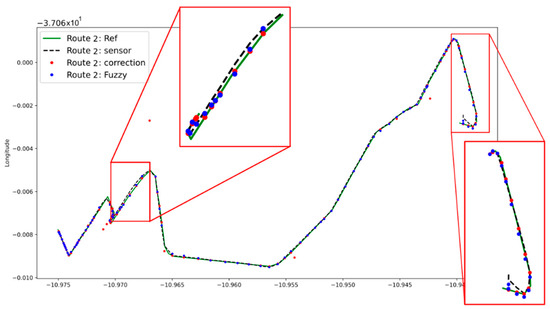 The purpose of the fuzzy systems is to get the data represented by the dashed black line as close as possible to the reference (green plot), in other words, the closer the blue are to the red dots, the better their performance will be. The red boxes in Figure 14 highlight two segments of the route where the correction made by the fuzzy systems is most noticeable.