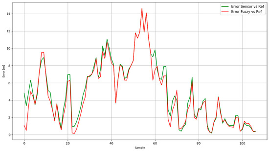 Figure 15 shows the error (in meters), between the sensor measurements and the reference (green graph); as well as the error between the output of the fuzzy systems and the reference (in red). From this image, it can be seen that—for most of the data—there is a reduction of the error when the proposed fuzzy systems are in action.