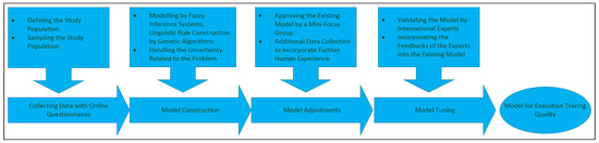 Conducting the research encompassed the following steps: (1) investigating the current state of the research in the field, (2) determining the goal of the study, (3) designing the data collection including (a) the identification of the study population and (b) the determination of the sampling method, (4) collecting the data with an online questionnaire [28], (5) performing exploratory data analysis and preprocessing the data, (6) constructing the model by the extraction of the linguistic rules of a fuzzy inference system by means of genetic algorithms from the collected data, (7) verifying the constructed model’s performance through a different machine learning approach (ANFIS) [24,25], (8) carrying out pre-validation and model adjustments in a mini-focus group, (9) validating the constructed model by engaging international experts through another online questionnaire [28] and tuning the model based on the feedback, and (10) writing the research report.