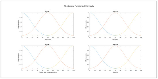 Modelling was performed in the Matlab R2021a environment, where a fuzzy inference system was created with four inputs and one output, according to the data set above. The input membership functions and their partitions are shown in Figure 4. The output membership functions were defined as five constants; i.e., zero-order membership functions were used in the output at the values {0, 25, 50, 75, 100} for the singleton fuzzy sets {very poor, poor, medium, good, very good}. The fuzzy inference system was constructed with the inference type Takagi–Sugeno–Kang [23] with no initial linguistic rules.