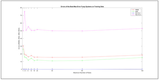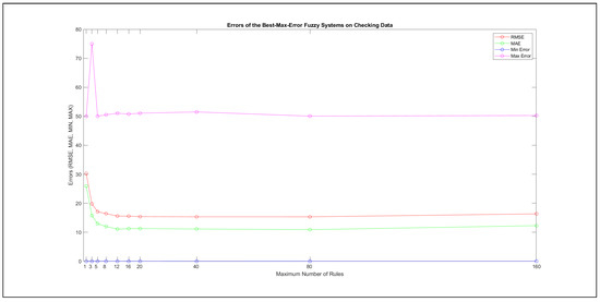 Thus, six iterations of five models were created for each rule limit in the set {1, 3, 5, 8, 12, 16, 20, 40, 80, 160}. In addition, the best results of the five models were collected for each rule limit in each of the six run suites. The predictions of the models with different numbers of maximal rules were analysed with regard to the mean absolute error (MAE), root mean squared error (RMSE), and minimal and maximal deviation from the desired target in the course of each run. The runs with the best performance, which come from run suite 2, are depicted in Figure 5, and the corresponding data are illustrated in Table 4 with regard to the training data set; moreover, the same runs are also shown in Figure 6 with regard to the checking data set, and the corresponding data are highlighted in Table 5. The RMSE indicators for the training data and the checking data are shown in Appendix B in Figure A18 and Figure A19; furthermore, the corresponding data are highlighted in Table A1 and Table A2. The machine learning process was ceased when the new generations produced by the genetic algorithm reached a saturation point with regard to the mean RMSE value of the individuals in the population.
