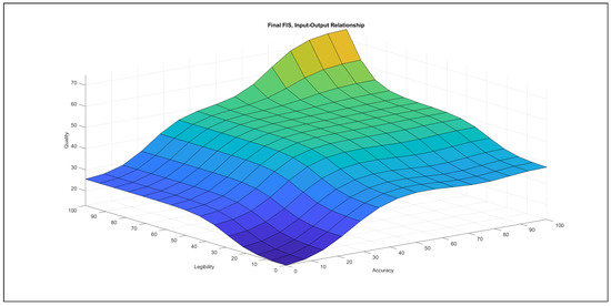 To describe the uncertainty associated with the quality modelling process, fuzzy logic [16,17] was used in this study. A basic and concise summary of the main concepts of fuzzy set theory and fuzzy logic is presented in [18]. The current research preferred fuzzy logic to evidential reasoning [19,20] due to its efficient modelling language implemented by linguistic rules and its capability to build adaptive systems. Linguistic rules are if–then rules that contain linguistic variables in the form of fuzzy sets [21,22]. As fuzzy sets make the description of a partial membership in a given set possible, the antecedents of the linguistic rules do not require a full match with the given conditions. In such cases, the consequent part is also partially applied according to the degrees of memberships. The effects of the different consequent parts of the linguistic rules are combined by the inference mechanism implemented, which is Takagi–Sugeno–Kang inference [23] in the present study. The basic steps of how to define a fuzzy inference system can be summarised in the following manner: (1) determining the inputs and input partitions—i.e., the regions to describe with fuzzy sets, (2) determining the outputs and output partitions, (3) determining the type of inference, (4) defining the membership functions for the inputs and for the output, (5) defining the linguistic rules, and (6) testing the system. The parameters of the membership functions and the number of the linguistic rules can be tuned adaptively [24,25,26,27].