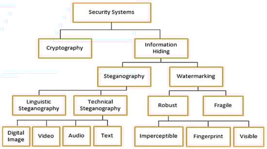 In the current era, developments in digital communication play a vital role in daily life. Improvements in web-based technologies coupled with information digitalization have significantly increased the use of data transfer. Information security is an important issue in the context of protecting user information. Although several existing approaches are robust and secure, work remains in progress to make these approaches safer and more secure in terms of performance indicators. In general, there are two classes of information security systems: information hiding and encryption []. Both classes are capable of protecting information; however, their approaches are different. The researchers in [] formulated different types of data encryption techniques. Figure 1 depicts a general data security mechanism classification, which interconnects the three techniques shown: steganography, watermarking, and cryptography. Steganography is divided into either linguistic or technical steganography, and watermarking is divided into robust or fragile watermarking.