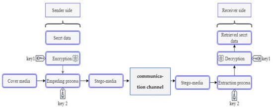 Steganography is another means of securing messages during data communication. Although both cryptography and steganography share the same objective, the approaches vary. In contrast with cryptography, steganography retains its original data by hiding it in other media [], whereas cryptography transforms the original data into ciphertext. The drawback of cryptography is the existence of the original data, irrespective of whether the original data are subject to encryption. Therefore, steganography methods offer a supplementary security layer for the message while communicating the data. Robustness in steganography and cryptography are viewed differently. When an attacker is able to access the actual data, then the cryptographic system is no longer secure. In contrast, if the attacker has authority over the secret data in the steganography system, the system is considered to no longer be secure [].