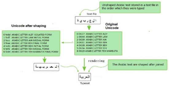 In [], the authors suggested a format-based text steganography technique for Arabic based on the Kashida and Unicode text (Zero-width non-joiner [ZWNJ] (discrete), zero-width joiner [ZWJ], little space, and zero-width space along with traditional spaces). The cover text can be used to conceal one bit of the secret text in each letter by transforming the letters using their position (i.e., end, middle, or beginning of a word, or an isolated word). Figure 6 demonstrates that the Arabic language letters are depicted differently despite sharing the same Unicode text corresponding to all shapes used in the file. The shapes of the letters are corrected using software that changes typographic sequence depending on letter position (i.e., isolated, end, middle, or beginning). Kashida, typed as “_”, represents a character in Arabic that extends a letter but does not change word meaning. The word (احمد) may be indicated as (احــمــد) by concatenating two Kashida characters to embed secret data. Embedding is performed in several layers. Every layer comprises the words sharing similar tags as evaluated by the part of speech (POS) tagging tool, which divides the cover text into lists of words in which each word is correlated with the corresponding POS. Words having a common POS are combined to form a layer. Subsequently, the word count for each layer is determined to sort them in ascending order. The stego key is employed to randomly select embedding layers to improve security. The outcomes of the study indicated that this method met the hiding capacity goal.