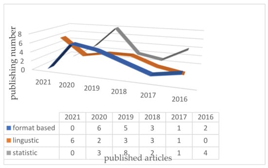 Text steganography is considered exceedingly difficult due to the inadequate redundant data in textual files compared with other digital media, such as audio, image, or video files []. Text steganography can be generally split into three classes, as depicted in Figure 5: linguistic, format-based, and random and statistical generation [].