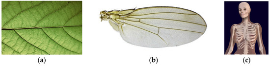 (a) Rib–skin structures in a plant leaf (Photo by Daniel Hodgkins on Unsplash (https://unsplash.com/photos/I7sNoicir_I, accessed on 7 September 2021)), (b) fly wing (Photo by Martin Hauser Phycus (https://commons.wikimedia.org/wiki/File:Wing_D_suzukii_female.jpg, accessed 27 October 2021)), and (c) the human body (Photo by Bernhard Ungerer (https://commons.wikimedia.org/wiki/File:3D_Female_Skeleton_Anatomy.png, accessed on 10 September 2021)).