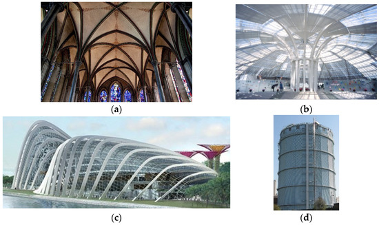 (a) Stiffened structures in the Salisbury cathedral (Photo by Tony Hisgett on Flickr (https://www.flickr.com/photos/hisgett/5690722283/, accessed on 8 September 2021)), (b) Yamanashi fruit museum (Photo by scarletgreen on Flickr (https://www.flickr.com/photos/9160678@N06/620307455/, accessed on 8 September 2021)), (c) garden at Marina South (Photo from eVolo (https://www.evolo.us/worlds-largest-climate-controlled-glasshouse-wilkinson-eyre-architects/, accessed on 8 September 2021)), and (d) gas holder (Photo by Richard Rogerson (https://commons.wikimedia.org/wiki/File:Gas_Holder_by_Battersea_Railway_Station_-_geograph.org.uk_-_1820717.jpg, accessed on 10 September 2021)).
