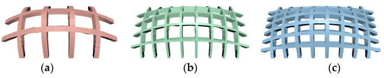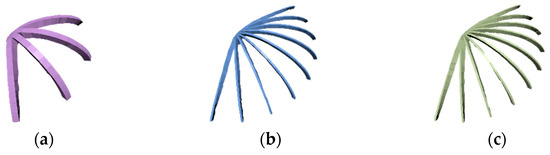 Figure 6 presents optimized supporting structures in the same radial direction. The total number and the total volume of the stiffeners for the optimized unidirectional stiffeners are shown in Figure 6 and given in Table 2, where (a) means Figure 6a and Figure 7a, (b) means Figure 6b and Figure 7b, and (c) means Figure 6c and Figure 7c. As shown in Table 2, Figure 6a has four stiffeners that reach the upper limits of the dimensions with a total volume of 3710.55 , but the stiffened shell still fails to satisfy the strength requirement. Figure 6b has the best output within the feasible domain, which has a total volume of 1301.65 . Figure 6c shows that more stiffeners are used than in Figure 6b, and the total volume 1658.35 was slightly larger than Figure 6b.
