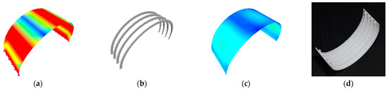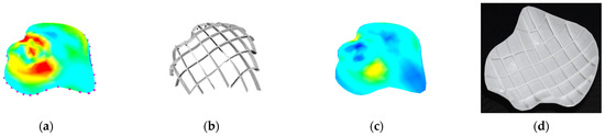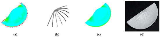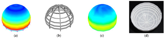 The calculated results of the hemisphere are presented in Figure 15 and Table 3. The maximum von Mises stress of the initial stress field depicted in Figure 15a without bidirectional stiffeners was 42.020 MPa. Figure 15b shows the optimized bidirectional stiffeners with a volume of 989.145 . With the optimized stiffeners, the maximum von Mises stress became 36.690 MPa (Figure 15c), and Figure 15d shows the 3D printed model.