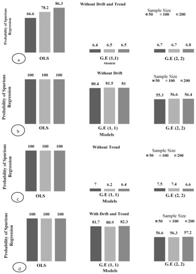 Figure 1 given below shows the probability of spurious regression on the basis of F-statistics for the coefficients of independent variable of the ordinary least square (OLS) and the autoregressive distributed lag model. The F-stats are used for joint significance of current and lag values of independent variable for the Ghouse equation. When autoregressive parameters θ1 = θ2 are equal to 1, the series are nonstationary. This comparison is made on the different sample sizes. The panel (a) of Figure 1 is an independent nonstationary series without having drift and trend. After ruing regression with OLS, we obtained a 66.6% probability of spurious regression when the sample size is 50, and 78.2% and 86.3% when the sample size is 100 and 200, respectively. It supported the argument of ref. [] that, as the sample size increased the independent nonstationary series, the probability of spurious regression also increased. While, at the sample size of 50, the Ghouse equation (1, 1) reduced this probability from 66.2% to just 6.2% and 78.2% to 6.5% for 100 and 86.3 to 6.5% for 200 sample sizes, respectively. This has very interesting implications in that the OLS increased in probability of spurious regression as the sample size increased, but the Ghouse equation retains its size in both small and large samples. The Ghouse equation (2, 2) represents the case of over specification. We intend to check its impact on the size of the test. The Ghouse equation (2, 2) also reduced this probability from 66%, 78.2%, and 86% to just around 6.7% for all sample sizes. This means over specification in the Ghouse equation model does not affect the size of the model.