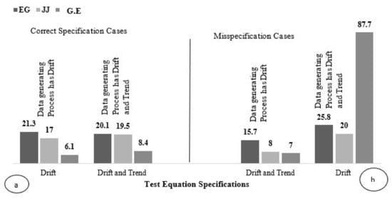 The (b) panel of Figure 2 shows the results of misspecification. The first case corresponds to over specification (over specified). In this case, the test equation takes drift and trend, while the data generation process only takes drift. So, the model is over-specified. In this case, the size of Engle Granger is 15.7% with a 10.7% size distortion and the Johansen Juselius size is 8% with just a 3% size distortion. However, the Ghouse equation size is 7% with 2% negligible size distortion. The second case of panel (b) of Figure 2 displays the results of under specification, in which the test equation contains only drift but the data-generating process has drift and trend. This means that the test equation suffers in trend misspecification. The Engle Granger and Johansen Juselius cointegration procedures sizes are 25.8% and 20%, respectively. While, the size of the Ghouse equation increased drastically around 87%, with an 82.7% size distortion. This means that the Ghouse equation badly suffers in the trend misspecification case. It can be covered by including trend in a test equation, as we can see in the second case of the panel (a) of Figure 2.