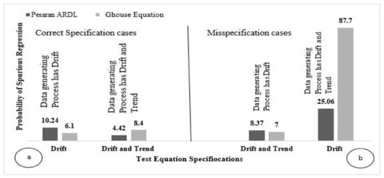 The underlying reason may be that, in the case of nonstationarity, these model specification techniques become worthless. The conventional econometric method OLS suffers a considerable size distortion problem when the series has a unit root. On the other hand, the Ghouse equation has no size distortion problem. It should be noted, however, that under specification—when the data-generating process contains a linear trend, but the trend is not included in the regression model—then both the OLS and the Ghouse equation suffer in size distortion. Regardless, even under the case of specification, the Ghouse equation significantly reduces the probability of spurious regression, as compared to OLS.