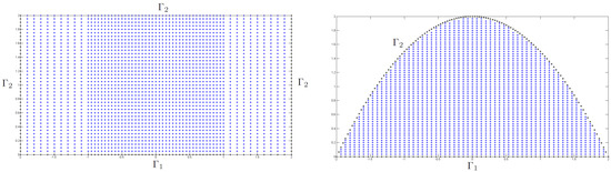 Here, denotes the border and . For our computational examples, the domains of Figure 1 are considered, where the distribution of the nodes is irregular. More precisely, and . The first mesh is generated in such a way that the number of nodes is higher in the centre, so the numerical solution is more accurate. The second mesh has a very irregular distribution of nodes near the border The second equation in system (5) is explicit in the time variable, i.e., it only depends on the solution of the numerical method in the previous time step. Therefore, to initialize the numerical method, one uses the solution of