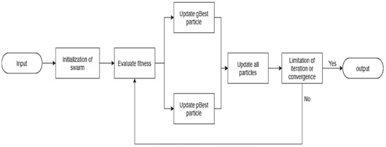 where r1 and r2 are two random parameters within [0, 1], c1 and c2 are the constants, and w is the inertia weight. The flowchart of the PSO algorithm is demonstrated in Figure 2.