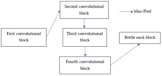 The original UNET has a symmetrical architecture, which means that the expansive path is created symmetrically to the contracting path. Thus, we only need to pay attention to the contracting path for the evolutionary computation. The UNET convolutional process is performed four times. We consider each process as a block of the convolution having two convolutional layers in the original architecture. This specific representation is demonstrated in Figure 4.