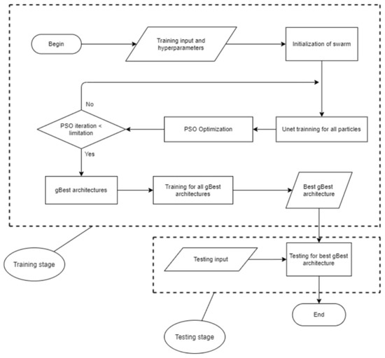 At first, a reasonable approach is to properly select the PSO-UNET model with the best hyper-parameters consisting of three groups: particle swarm optimization, UNET architecture initialization and PSO-UNET training.
