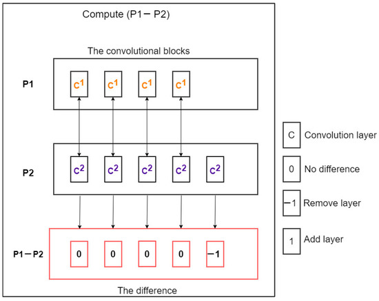 In order to calculate the velocity of the specific particle, we need to represent how the difference of the two contracting paths are computed. There are four blocks in all random particles so that calculating the difference between two blocks at the same position are detailed. The others are processed similarly. Figure 6 is an example of this procedure, in which the number of convolution layer in each block is taken into consideration. Additionally, the computation is always performed with respect to the first blocks. The difference will be zero at the same position that two blocks have the presence of the convolution layer. It means these position in the block will be kept with its corresponding hyper-parameters at the updating procedure. If the first block has less (more) ‘t’ number of layers than the second, the number of −−1 (+1) added to the difference will be ‘t’, with the hyper-parameters of the layers of the second block.