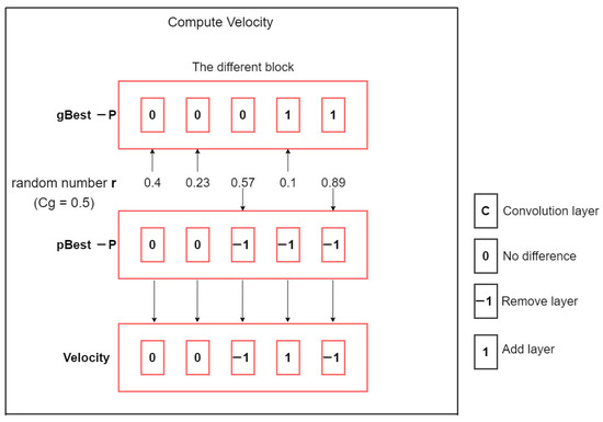 At each iteration, the velocity of each particle (P) is the virtual information for the evolutionary procedure. This is computed through the current particle best position (pBest) and the global best position (gBest) [27]. In order to calculate the velocity, it needs to know two differences (gBest—P) and (pBest—P), which is pointed out at the Section 3.1. As mentioned before, we only need to demonstrate the difference between two blocks at the same order in the contracting path. An overview of this procedure is shown in Figure 7 in which the two top rows are the difference blocks of (gBest—P) and (pBest—P), respectively. In the proposed method, we define initially the decision factor Cg in order to determine what layer the block of the velocity will be selected from (gBest—P) or (pBest —P). In order to achieve this proposal, we generate a random number r uniformly at [0.1). If r < Cg, the block of the velocity will choose the layer from the difference (gBest—P). Otherwise, the algorithm will select the layer and its corresponding hyper-parameters from (pBest—P) and put it in the block of the final velocity at the corresponding position [27].