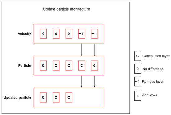 The procedure of updating the particle architecture is an uncomplicated and straightforward. It acts as an incentive for the current particle to reach a superior architecture in the proposed algorithm. According to the achieved velocity, each particle can upgrade by adding or removing the convolution layer in all its blocks. An instance of updating a particle with its velocity is described in the Figure 8 bellow.